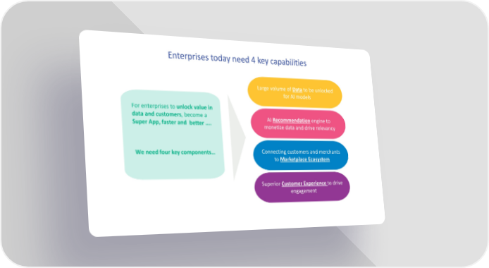 Enterprises today need 4 key capabilities Large volume of Data to be unlocked for AI models For enterprises to unlock value in data and customers, become a AI Recommendationengine to Super App, faster and better .... monetize data and drive relevancy We need four key components… Connecting customers and merchants to Marketplace Ecosystem Superior Customer Experience to drive engagement