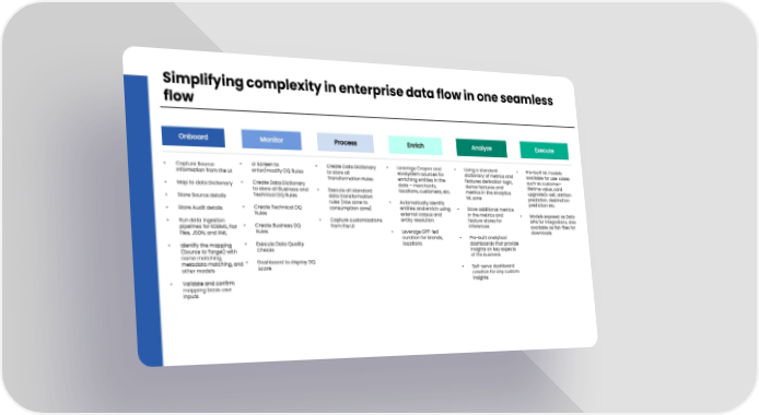 Simplifying complexity in enterprise data flow in one seamless flow Onboard Monitor Process Enrich Analyze Execute • Capture Source Information from the UI • Map to data Dictionary • Store Source details • Store Audit details • Run data ingestion pipelines for RDBMS, flat files, JSON, and XML • Identify the mapping (Source to Target) with name matching, metadata matching, and other models • Validate and confirm mapping basis user inputs • UI Screen to enter/modify DQ Rules • Create Data Dictionary to store all Business and Technical DQ Rules • Create Technical DQ Rules • Create Business DQ Rules • Execute Data Quality Checks • Dashboard to display DQ Score • Create Data Dictionary to store all Transformation Rules • Execute all standard data transformation rules (raw zone to consumption zone) • Capture customizations from the UI • Leverage Crayon and ecosystem sources for enriching entities in the data – merchants, locations, customers, etc. • Automatically identify entities and enrich using external corpus and entity resolution • Leverage GPT - led curation for brands, locations • Using a standard dictionary of metrics and features derivation logic, derive features and metrics in the Analytics ML zone • Store additional metrics in the metrics and feature stores for inferences • Pre - built analytical dashboards that provide insights on key aspects of the business • Self - serve dashboard creation for any custom insights • Pre - built ML models available for use - cases such as customer - lifetime value, card upgrade/x - sell, attrition prediction, destination prediction etc. • Models exposed as Data APIs for integrations, also available as flat - files for downloads
