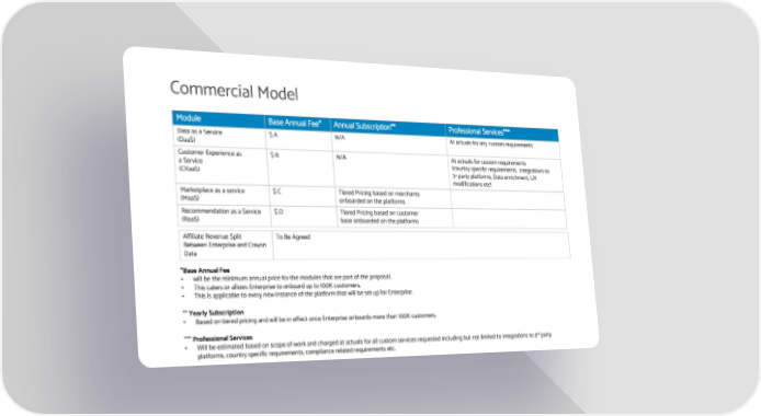 Commercial Model Module Base Annual Fee* AnnualSubscription** Professional Services*** Data as a Service $ A N/A At actuals for any custom requirements (DaaS) Customer Experience as $ B N/A At actuals for custom requirements aService (country specific requirements, integrations to (CXaaS) 3rd party platforms, Data enrichment, UX modifications etc) Marketplace as a service $ C Tiered Pricing based on merchants (MaaS) onboardedon the platforms Recommendation as a Service $ D Tiered Pricing based on customer (RaaS) baseonboarded on the platforms Affiliate Revenue Split To Be Agreed BetweenEnterprise and Crayon Data *Base Annual Fee • will be the minimum annual price for the modules that are part of the proposal. • This caters or allows Enterprise to onboard up to 100K customers. • This is applicable to every new instance of the platform that will be set up for Enterprise. ** Yearly Subscription • Based on tiered pricing and will be in effect once Enterprise onboards more than 100K customers. *** Professional Services • Will be estimated based on scope of work and charged at actuals for all custom services requested including but not limited to integrations to 3rd party platforms, country specific requirements, compliance related requirements etc.