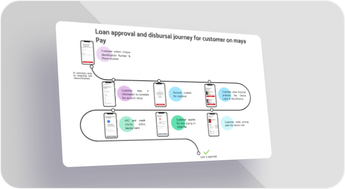 Loan approval and disbursal journey for customer on maya Pay M1 Customer Registration Customer enters Unique Identification Number & Phone Number ID verification done by integrating with national database Customer keys in Account created Customer views financial information to complete for customer products like Device the account setup Loans & Microfinance KYC and credit Customer applies checks before for loan paying an Customer views pricing issuing loans initial fee plans for device loan Loan is approved