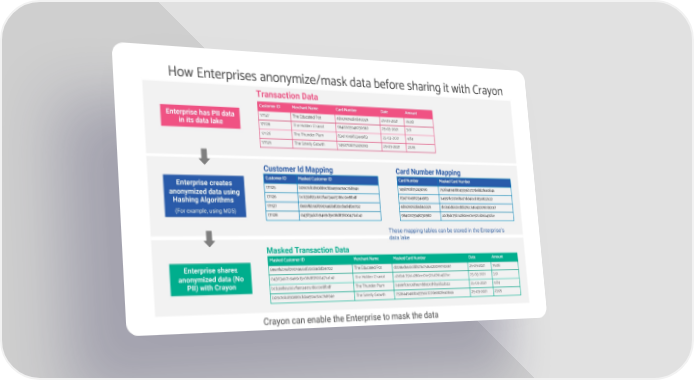 How Enterprises anonymize/mask data before sharing it with Crayon Transaction Data Customer ID Merchant Name Card Number Date Amount Enterprise has PII data 171127 The Educated Pot 4850909284846029 25-03-2021 35.08 in its data lake 171128 The Hidden Chariot 9840203948230982 25-03-2021 3.91 171126 The Thunder Plum 8347104982344983 25-03-2021 4.84 171125 The Smelly Growth 1458710875243090 25-03-2021 23.95 Customer Id Mapping Card Number Mapping Enterprise creates Customer ID Masked Customer ID Card Number Masked Card Number anonymized data using 171125 b09c16fcd90889cfdaa59ac9ac76894e 1458710875243090 75284494dd043356b727de882fea084a Hashing Algorithms 171126 bcb39d95c667faa134415186c0e8fbdf 8347104982344983 b4991fc9706f9a71dd40cd1856822b22 (For example, using MD5) 171127 8e69f6b56f0905a684f20c8ad4f2e702 4850909284846029 dc0a6d660cdd3216c546420095130ce7 171128 043f134b2b9469d5e08d8780047bab41 9840203948230982 a2d9dc79b1a280ee01e921af26b492be These mapping tables can be stored in the Enterprise’s data lake Masked Transaction Data Masked Customer ID Merchant Name Masked Card Number Date Amount Enterprise shares 8e69f6b56f0905a684f20c8ad4f2e702 The Educated Pot dc0a6d660cdd3216c546420095130ce7 25-03-2021 35.08 anonymized data (No 043f134b2b9469d5e08d8780047bab41 The Hidden Chariot a2d9dc79b1a280ee01e921af26b492be 25-03-2021 3.91 PII) with Crayon bcb39d95c667faa134415186c0e8fbdf The Thunder Plum b4991fc9706f9a71dd40cd1856822b22 25-03-2021 4.84 b09c16fcd90889cfdaa59ac9ac76894e The Smelly Growth 75284494dd043356b727de882fea084a 25-03-2021 23.95 Crayon can enable the Enterprise to mask the data