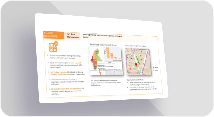 ACQUIRE • Territory • Identify potential merchants toacquire in everygeo- MERCHANTS Management location HyperLocalMarketSizing&Targets HyperLocal‘TastePrints’ Sizing Mobile-based territory management of key metrics with built-in daily feedback Equipterritory managersto plan, acquire& managecustomer/merchants toreach100% Inclusion goals Inactive A/BTesting Framework&Models forDriving Active Monthly Active Users (Customers&Merchants) DailySalesPerformance Trackingfor The territory management console shows Opportunity basedontaste: merchants &customersby territory managers current penetration across merchants, agents and teams and customers 2000customersin theareahave anaffinity for transacting at the restaurant ML-basedterritory-level pricingsimulator to $4,500is thepotentialvalue that can be measure, modify &drive revenuesacross generated fromthese customersin amonth territories