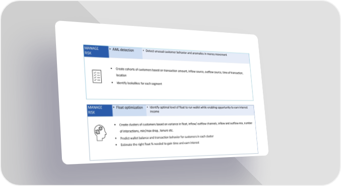 MANAGE • AMLdetection • Detectunusualcustomerbehaviorandanomaliesinmoneymovement RISK Createcohortsofcustomersbasedontransactionamount,inflowsource,outflowsource,timeoftransaction, location Identify lookalikes for each segment MANAGE • Float optimization • Identify optimal level offloat to run wallet while enabling opportunity to earn interest RISK income Createclustersofcustomersbasedonvarianceinfloat,inflow/outflowchannels,inflowandoutflowmix,number ofinteractions, min/maxdrop,tenureetc. Predict wallet balance andtransactionbehaviorforcustomersineachcluster Estimate the right float % needed to gain time and earn interest