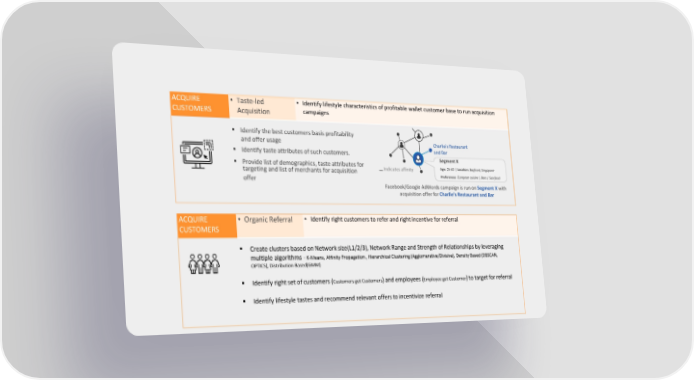 ACQUIRE • Taste-led • Identify lifestyle characteristics of profitable wallet customer base to run acquisition CUSTOMERS Acquisition campaigns Identify thebestcustomersbasisprofitability andofferusage Charlie’s Restaurant Identify tasteattributes ofsuchcustomers. andBar Providelistofdemographics,tasteattributesfor SegmentX targeting and list of merchants foracquisition Indicatesaffinity Age:25-30 | Location: Bayfront,Singapore offer Preferences: European cuisine | Bars | Sea-food Facebook/GoogleAdWordscampaignis runonSegment Xwith acquisition offer for Charlie’s Restaurant and Bar ACQUIRE • OrganicReferral • Identify right customers toreferandright incentive forreferral CUSTOMERS Createclusters basedonNetworksize(L1/2/3),NetworkRangeandStrengthofRelationshipsbyleveraging multiple algorithms -K-Means,AffinityPropagation,HierarchicalClustering(Agglomerative/Divisive), DensityBased(DBSCAN, OPTICS), Distribution Based(GMM) Identify right set of customers (CustomersgetCustomers)and employees (EmployeegetCustomer)totargetforreferral Identify lifestyle tastes and recommend relevant offerstoincentivize referral