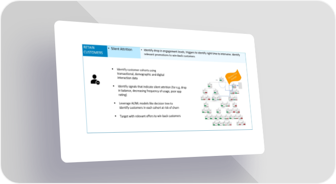 RETAIN • Silent Attrition • Identify dropinengagementlevels,triggerstoidentifyrighttimetointervene. Identify CUSTOMERS relevant promotions to win-back customers Identify customercohortsusing transactional, demographic anddigital interaction data Identify signals that indicate silent attrition (for e,g, drop in balance, decreasing frequency ofusage, poorapp rating) LeverageAI/MLmodelslikedecisiontreeto identify customers in eachcohortatrisk ofchurn Targetwithrelevantofferstowin-backcustomers