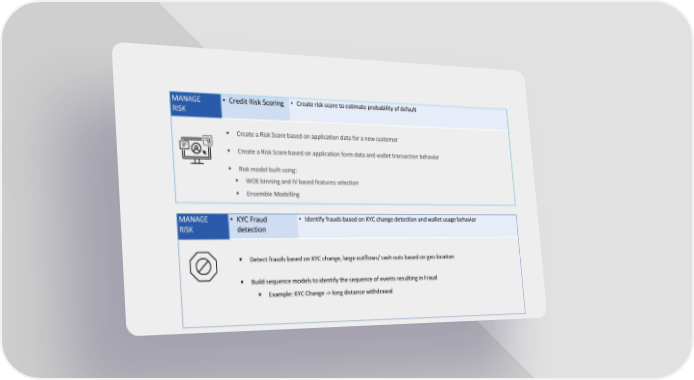 MANAGE • Credit Risk Scoring • Createriskscoretoestimateprobability ofdefault RISK CreateaRiskScorebasedonapplicationdataforanewcustomer CreateaRiskScorebasedonapplicationformdataandwallettransactionbehavior Risk modelbuilt using: WOEbinningandIVbasedfeaturesselection EnsembleModelling MANAGE • KYCFraud • Identify frauds based onKYCchangedetectionandwalletusagebehavior RISK detection DetectfraudsbasedonKYCchange,largeoutflows/cashoutsbasedongeolocation Build sequencemodelstoidentifythesequenceofeventsresultinginFraud Example:KYCChange->longdistancewithdrawal