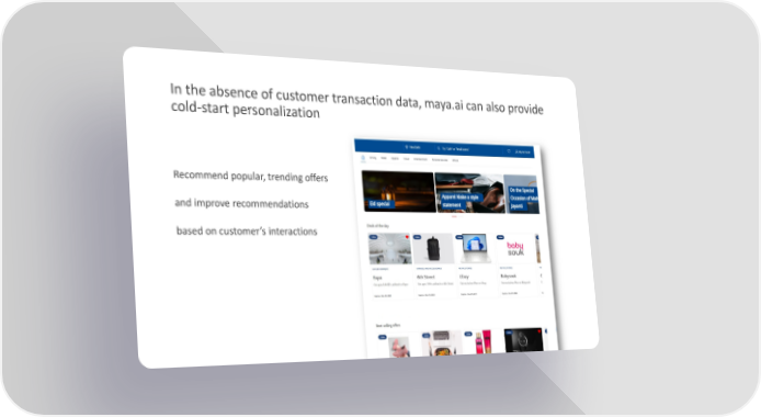 In the absence of customer transaction data, maya.ai can also provide cold-start personalization Recommend popular, trending offers and improve recommendations based on customer’s interactions