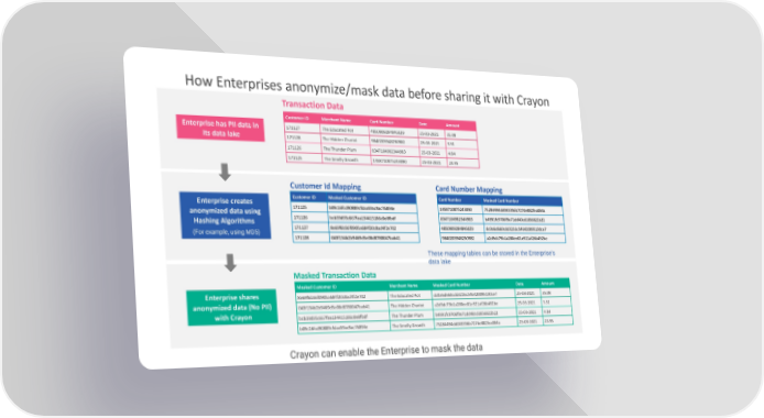 How Enterprises anonymize/mask data before sharing it with Crayon Transaction Data Customer ID Merchant Name Card Number Date Amount Enterprise has PII data in 171127 The Educated Pot 4850909284846029 25-03-2021 35.08 its data lake 171128 The Hidden Chariot 9840203948230982 25-03-2021 3.91 171126 The Thunder Plum 8347104982344983 25-03-2021 4.84 171125 The Smelly Growth 1458710875243090 25-03-2021 23.95 Customer Id Mapping Card Number Mapping Enterprise creates Customer ID Masked Customer ID Card Number Masked Card Number anonymized data using 171125 b09c16fcd90889cfdaa59ac9ac76894e 1458710875243090 75284494dd043356b727de882fea084a Hashing Algorithms 171126 bcb39d95c667faa134415186c0e8fbdf 8347104982344983 b4991fc9706f9a71dd40cd1856822b22 (For example, using MD5) 171127 8e69f6b56f0905a684f20c8ad4f2e702 4850909284846029 dc0a6d660cdd3216c546420095130ce7 171128 043f134b2b9469d5e08d8780047bab41 9840203948230982 a2d9dc79b1a280ee01e921af26b492be These mapping tables can be stored in the Enterprise’s data lake Masked Transaction Data Masked Customer ID Merchant Name Masked Card Number Date Amount Enterprise shares 8e69f6b56f0905a684f20c8ad4f2e702 The Educated Pot dc0a6d660cdd3216c546420095130ce7 25-03-2021 35.08 anonymized data (No PII) 043f134b2b9469d5e08d8780047bab41 The Hidden Chariot a2d9dc79b1a280ee01e921af26b492be 25-03-2021 3.91 with Crayon bcb39d95c667faa134415186c0e8fbdf The Thunder Plum b4991fc9706f9a71dd40cd1856822b22 25-03-2021 4.84 b09c16fcd90889cfdaa59ac9ac76894e The Smelly Growth 75284494dd043356b727de882fea084a 25-03-2021 23.95 Crayon can enable the Enterprise to mask the data