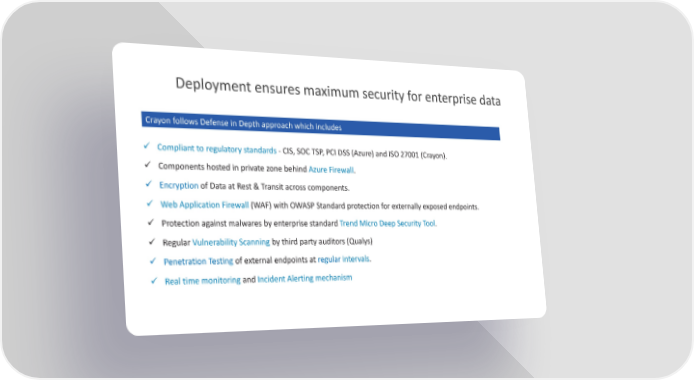Deployment ensures maximum security for enterprise data Crayon follows Defense in Depth approach which includes ü Compliant to regulatory standards - CIS, SOC TSP, PCI DSS (Azure) and ISO 27001 (Crayon). ü Components hosted in private zone behind Azure Firewall. ü Encryption of Data at Rest & Transit across components. ü Web Application Firewall (WAF) with OWASP Standard protection for externally exposed endpoints. ü Protection against malwares by enterprise standard Trend Micro Deep Security Tool. ü RegularVulnerability Scanning by third party auditors (Qualys) ü Penetration Testing of external endpoints at regular intervals. ü Real time monitoring and Incident Alerting mechanism