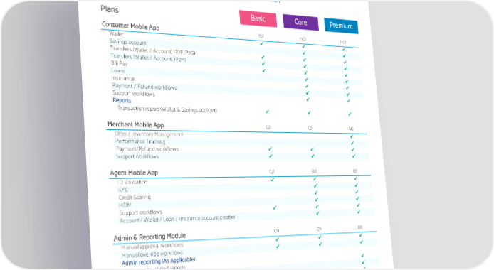 Scope for Digital Wallet Plans Basic Core Premium Consumer Mobile App (5) (10) (10) Wallet ✓ ✓ ✓ Savings account ✓ ✓ Transfers (Wallet / Account) (P2P, P2G) ✓ ✓ ✓ Transfers (Wallet / Account) (P2M) ✓ ✓ ✓ Bill Pay ✓ ✓ ✓ Loans ✓ ✓ Insurance ✓ ✓ Payment / Refund workflows ✓ ✓ Support workflows ✓ ✓ Reports Transaction report (Wallet & Savings account) ✓ ✓ ✓ Merchant Mobile App (2) (2) (4) Offer / Inventory Management ✓ Performance Tracking ✓ Payment/Refund workflows ✓ ✓ ✓ Support workflows ✓ ✓ ✓ Agent Mobile App (2) (6) (6) ID Validation ✓ ✓ ✓ KYC ✓ ✓ Credit Scoring ✓ ✓ MDM ✓ ✓ Support workflows ✓ ✓ ✓ Account / Wallet / Loan / Insurance account creation ✓ ✓ Admin & Reporting Module (2) (2) (8) Manual approval workflows ✓ ✓ ✓ Manual override workflows ✓ ✓ ✓ Admin reporting (As Applicable) Accounts related reports ✓ AML related reports ✓ Customer related reports ✓ Agents/ Merchants related reports ✓ Account Statuses (Active / Inactive / Dormant) ✓ Customized Reports ✓