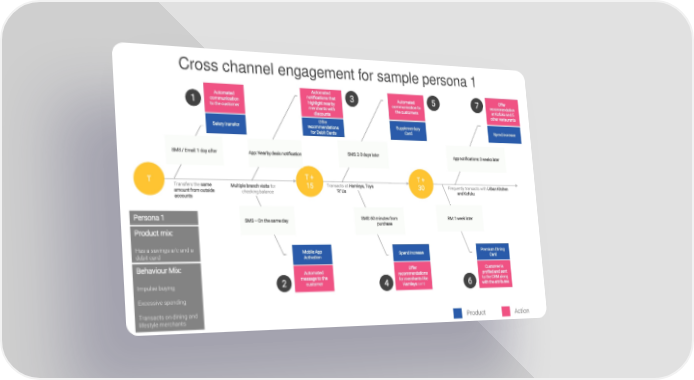 Cross channel engagement for sample persona 1 Automated Offer Automated notifications that 3 Automated 5 7 recommendation 1 communication highlight nearby communication to at Kofuku and 5 to the customer merchants with the customers other restaurants discounts Offer Supplementary Salary transfer recommendations Card Spend increase for Debit Cards SMS / Email: 1 day after App: Nearby deals notification SMS: 2-3 days later App notifications: 3 weeks later T + T + T Transfers the same Multiple branch visits for 15 Transacts at Hamleys, Toys 30 Frequently transacts with Urban Kitchen amount from outside checking balance ‘R’ Us and Kofuku accounts Persona 1 SMS –On the same day SMS: 60 minutes from RM: 1 week later purchase Product mix: Has a savings a/c and a Mobile App Premium DIning debit card Activation Spend Increase Card Behaviour Mix: Automated Offer Customer is message to the recommendations profiled and sent Impulse buying 2 customer 4 for merchants like 6 to the CRM along Hamleyssent with the attributes Excessive spending Transacts on dining and lifestyle merchants Product Action