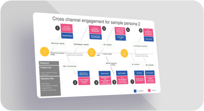 Cross channel engagement for sample persona 2 Automated Automated 3 Customer profiled 6 8 Offer communication message sent on and sent to the recommendation 1 to the customer Whatsapp/SMS CRM along with at Kofuku and 5 the attributes other restaurants Personal Finance WhatsappBanking Forex Prepaid Spend increase Recommendation Card SMS / Email: 1 day after SMS/Whatsapp: 1 week later RM: 1 week later App notifications: 3 weeks later T + T + T Personal Loan matures in Repeated usage of the app for 15 Transacts at SpiceJet multiple 30 Historically made high ticket 30 days transferring and maintenance times purchases in the auto category Persona 2 SMS: 60 minutes from RM: 1 week later purchase RM: 1 month later Product mix: SMS –On the same day Has a current a/c and a Digital sales for Spend Increase Car Finance Motor Insurance credit card Personal Finance Spend Increase Behaviour Mix: Staycations and Offer E-mail sent to the In-app notification hotel recommendations SMS/E-mail sent customer to the selected recommendations for merchants to the customer recommending Tech-Savvy 2 customer 4 sent to the 5 similar to Spicejet 7 motor insurance Automobile Enthusiast, customer via e-Mail Frequent Flyer Future Entrepreneur Product Action